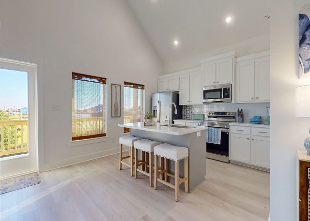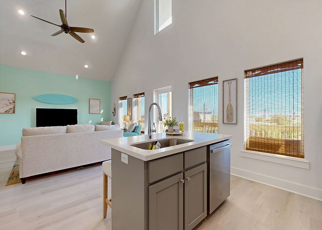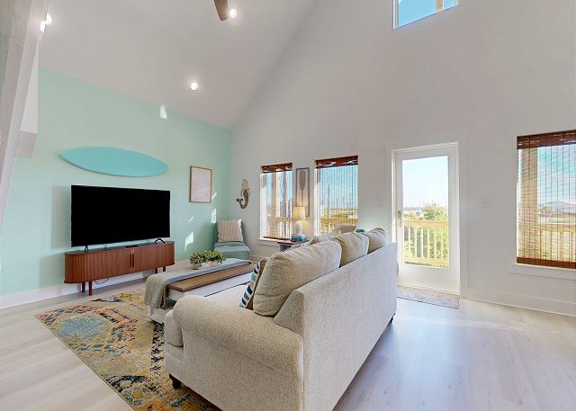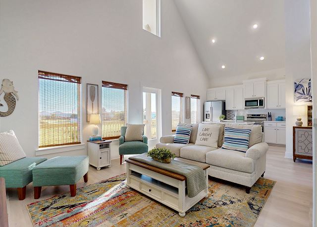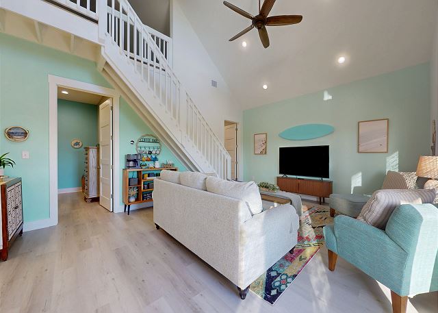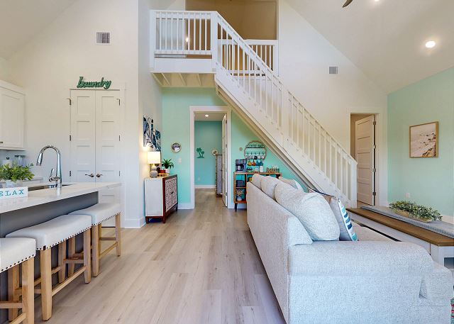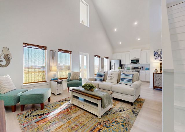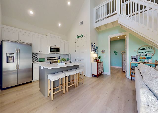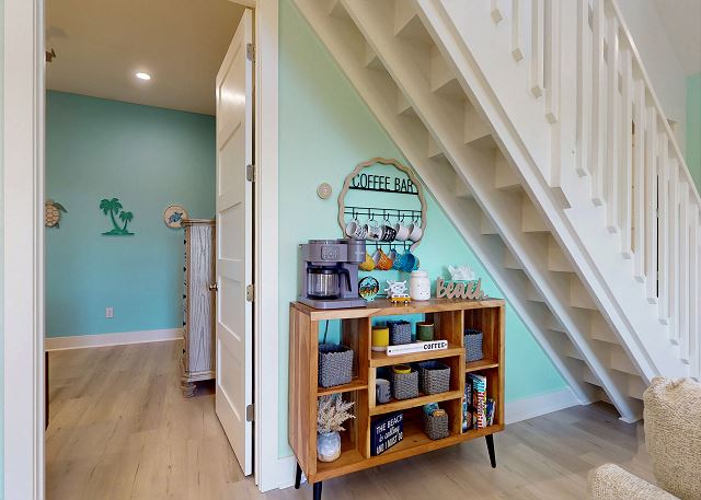 Step inside to an inviting open-concept living area filled with natural light, coastal décor, and all the comforts of home. The cozy living room is perfect for relaxing after a day at the beach. The fully equipped kitchen has everything you need for easy vacation meals, and there is a charming coffee bar that includes both Keurig and regular drip coffee makers. Other conveniences include a washer and dryer on-site, and high speed internet for your streaming needs.